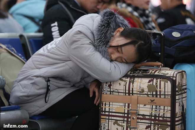 北京西站候车室,一名女性旅客在等待进站乘车时睡着了。(南方周末记者 张涛、翁洹/图)