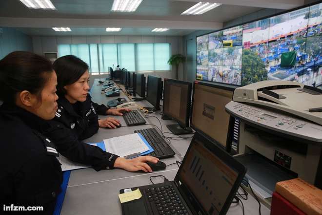 2017年1月16日,广州火车站隔壁的流花派出所里,监控大厅里的民警正在密切注视火车站广场上的动态。(南方周末记者 张涛、翁洹/图)