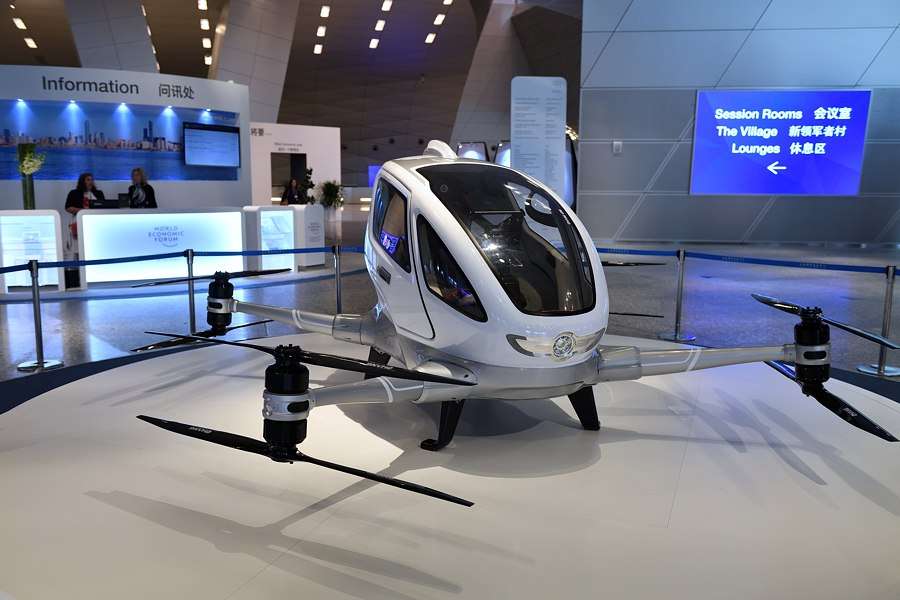 正对参会者入口的一处展台上的亿航184载人无人机。是全球第一款可载客的无人驾驶飞机,由总部位于中国广州的亿航智能技术有限公司独立自主研发制造。