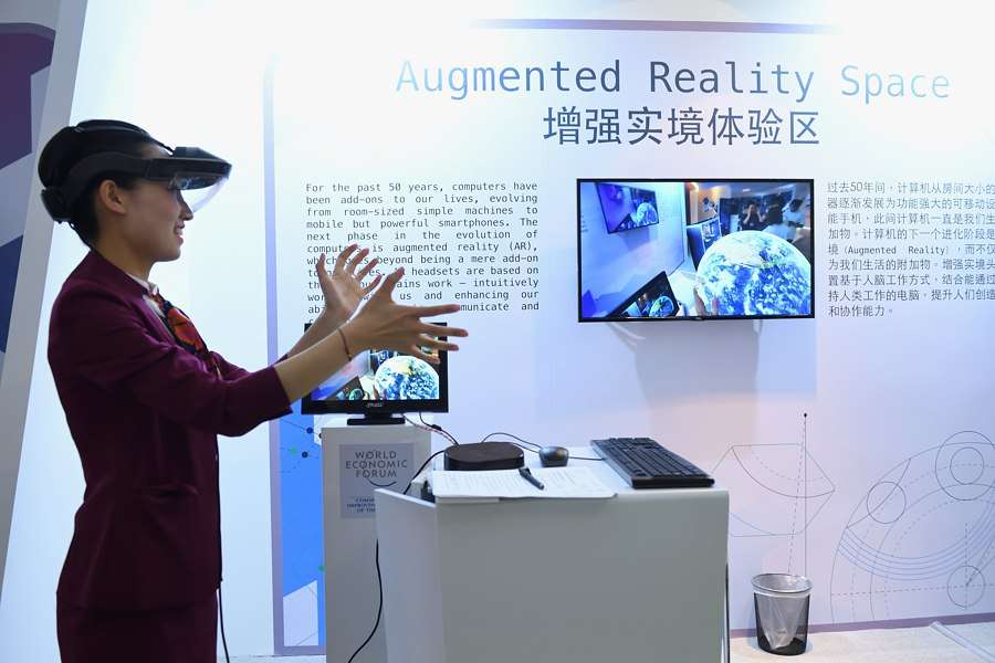 一位志愿者正在体验一款增强实境头戴式装置。它基于人脑工作方式,结合能通过感知支持人类工作的电脑,提升人们创造、交流和协作的能力。在未来,计算机不再仅仅是人类生活的附加物。