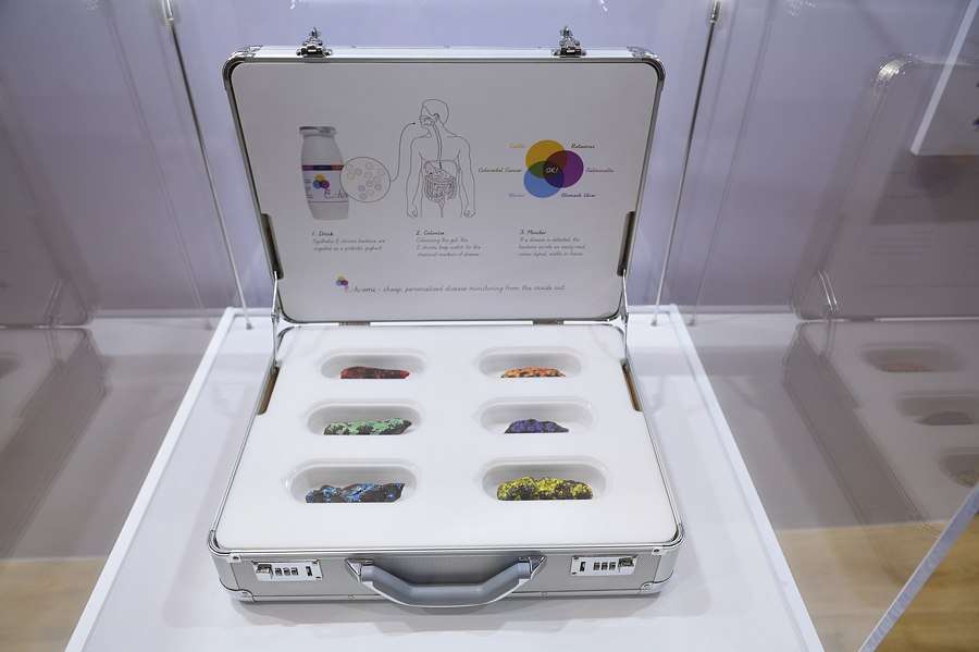 若早餐能检出癌症,将会怎样?Alexandra Daisy Ginsberg(英国)、James King(英国)与剑桥大学iGEM 2009团队创作的《E. chromi:"The Scatalog"》。2009年,七名大学本科生通过基因工程技术,培养出了一种能够分泌各种肉眼可见色素的大肠杆菌,并称之为“E. chromi”。Scatalog则试图借助这种技术,进行低成本、个性化的疾病检测。一旦检测到疾病,细菌就会发出一种易于分辨的信号——染色大便。