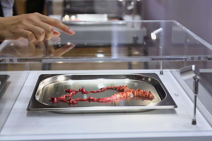第四次工业革命生物实验室。探讨这一次革命将给各种生物带来的影响。两位工作人员在《编辑05049的猪》展位上交谈。荷兰艺术家Chrstien Meindertsma花了三年时间,来追踪一头猪所加工而成的所有产品。