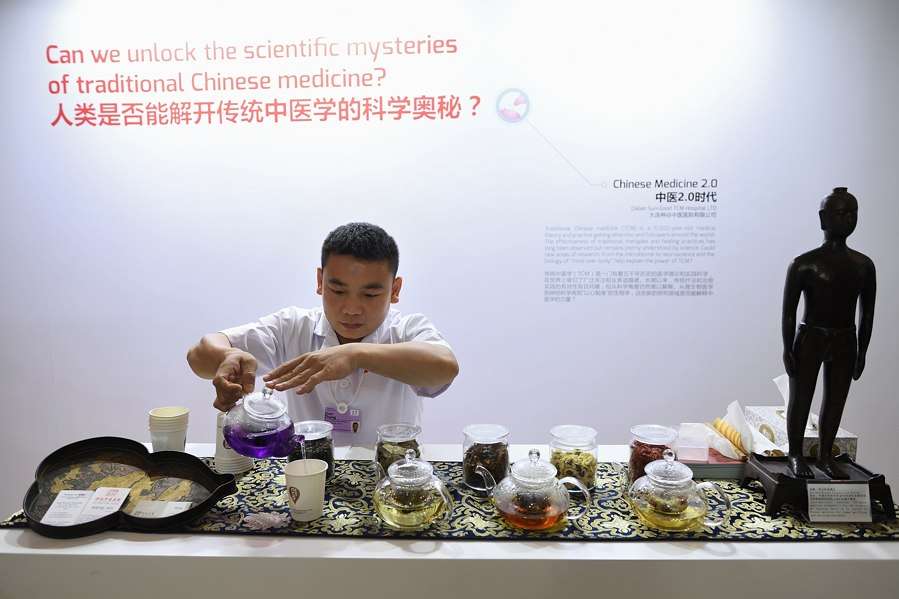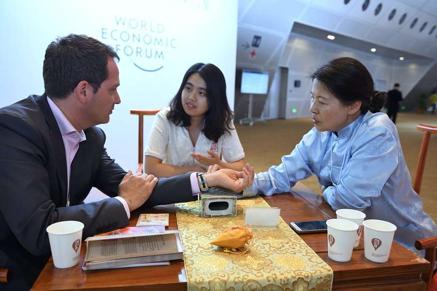 一位外籍参会者正在接受中医把脉服务。传统中医学在世界上吸引了广泛关注和众多的追随者。
