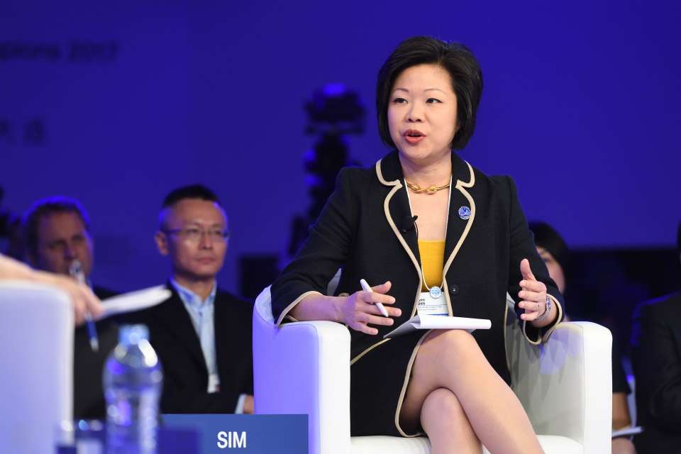 新加坡贸工部高级政务部长Ann sim在“战略动态:制造业系统”论坛上发言。