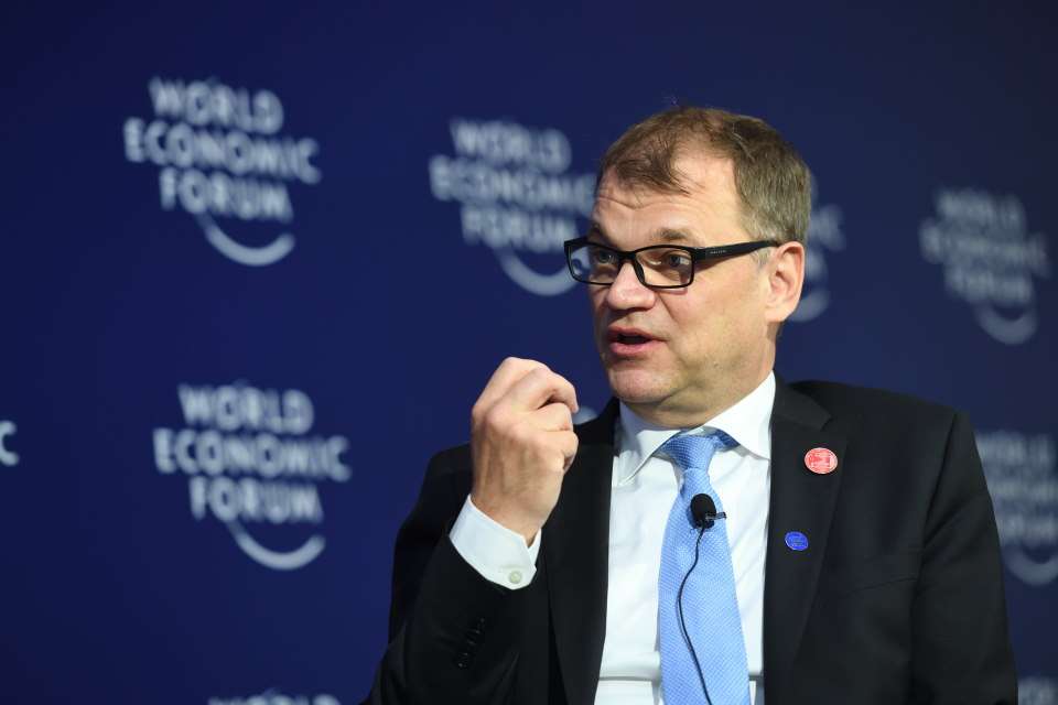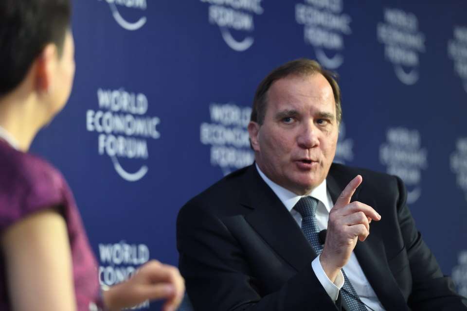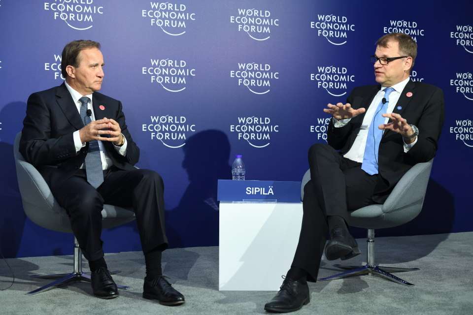 “全球挑战:北欧视角”媒体发布会上,瑞典首相勒文(左)、芬兰总理西比莱。讨论内容:新技术正在重塑教育和就业体系,在此背景下,北欧国家如何确保增长和治理的包容性?