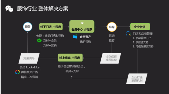 发布会当天,微信团队还发布了“微信+服饰行业解决方案”。据介绍,服饰行业可以通过微信公众号、小程序、“支付+会员”、企业微信等微信综合能力进行线上线下会员导入、用户画像分析、品牌线上传播、员工管理培训和线上电商销售,帮助企业打通获客、转化、留存、复购等不同诉求的服务数据,也能让开店、巡店、培训在一部手机里搞定。