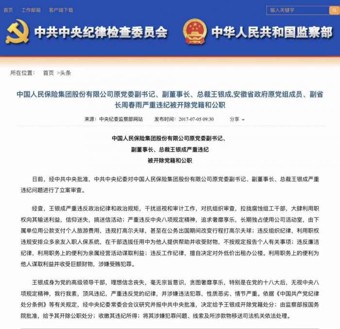 7月5日,中纪委网站消息,经中共中央批准,中共中央纪委对中国人民保险集团股份有限公司原党委副书记、副董事长、总裁王银成严重违纪问题进行了立案审查。