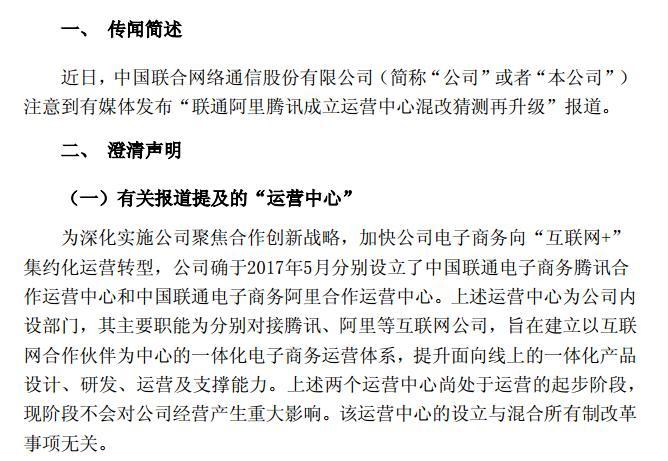 8月8日晚间,中国联通发布澄清公告称,近日,有媒体发布“联通阿里腾讯成立运营中心混改猜测再升级”报道。对此中国联通澄清,该运营中心的设立与混合所有制改革事项无关。截至本公告日,公司与潜在投资者的谈判工作尚在进行中,公司并未与任何潜在投资者签署过具有约束力的框架协议、认购协议等法律文件。