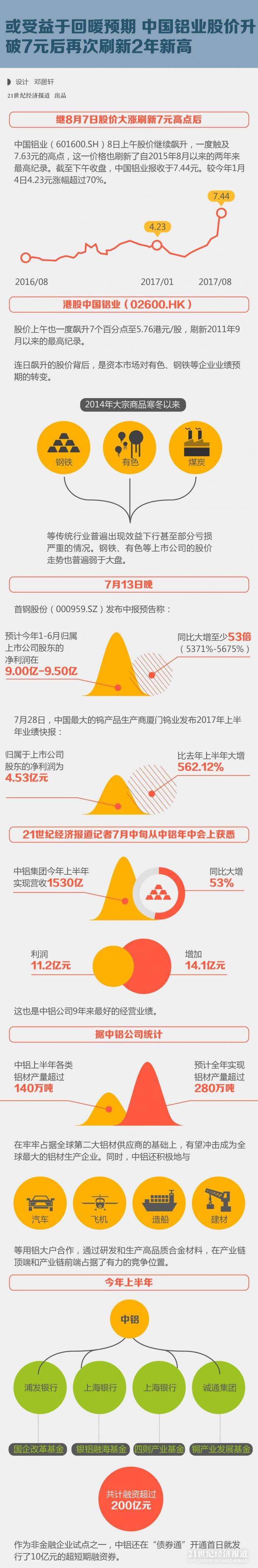 继8月7日股价大涨刷新7元高点后,中国铝业(601600.SH)8日上午股价继续飙升,一度触及7.63元的高点,这一价格也刷新了自2015年8月以来的两年来最高纪录。截至8日中午11:30,中国铝业盘中收于7.23元,较今年1月4日4.23元涨幅超过70%。
