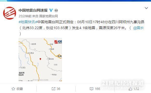 中国地震台网正式测定:08月10日17时48分在四川阿坝州九寨沟县(北纬33.22度,东经103.85度)发生4.1级地震,震源深度26千米。