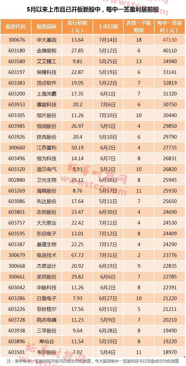 不过受多重因素影响,申购新股的收益率总体呈持续下滑趋势。据记者统计,今年5月份以来上市且已开板的新股有104只。上述104股中签的平均盈利已降至1.73万元,中一签盈利超过4万元的只有两只,除了华大基因外,还有一只为金牌厨柜,盈利为4.01万元。
