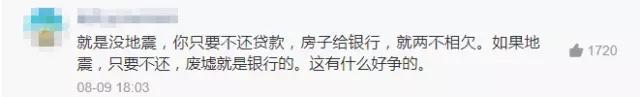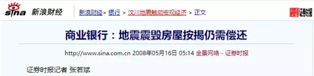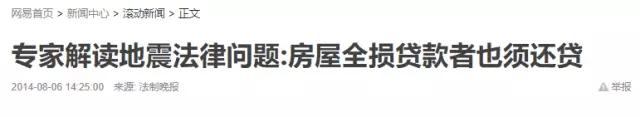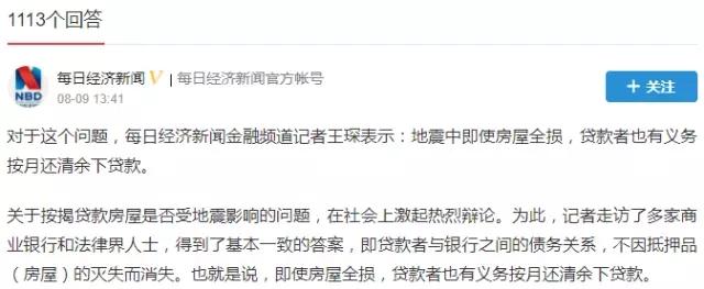 对此,昨日(8月9日),每日经济新闻(微信号:nbdnews)记者在走访多家商业银行和法律界人士后,也在该问题下给出了答案:地震中即使房屋全损,贷款者也有义务按月还清余下贷款。