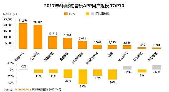 一年时间过去,根据2017年Quest Mobile发布的最新数据,在截至2017年6月的移动音乐用户规模中,腾讯系三大音乐App独占鳌头。
