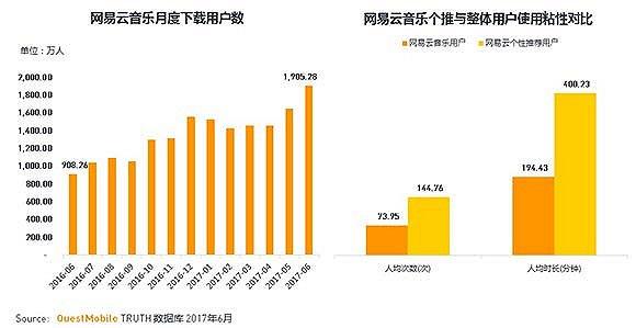 但网易云音乐的特点是新下载用户增长强劲,个性推荐用户粘性高。2017年6月,新下载用户达1905.28万人,同比增长率达109.77%。