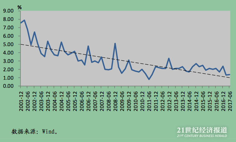 近年来,我国金融机构超额准备金率总体呈下行态势。 2001 年超额准备金率超过 7%,之后总体呈下降态势,2003-2008 年平均超额准备金率在 3.5%左右,之后进一步下行,目前超额准备金率在1.5%左右。