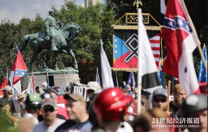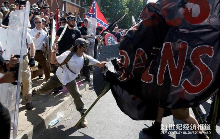 极右派团体12日上午再度集结举行大规模示威活动,有些人还拿着纳粹和邦联旗帜,并与左派反抗议团体发生冲突。一边挥舞“非裔的命也是命”的旗帜,另一边则高呼“白人的命也是命”。