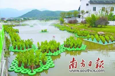 “我们村里不但配套了2000多平方米的人工湿地系统,还建了800平方米的生态浮床,通过种植菖蒲、美人蕉来净化水质,周边配套建设围栏、亲水平台、名木等景观”,梅州市蕉岭县三圳镇九岭村党支部书记徐文坚告诉记者,如今村里的生活污水经过处理以后排到了这个池塘,由植物进行吸附,池塘流出去的水达到了三类排放标准,可以用于灌溉农田。