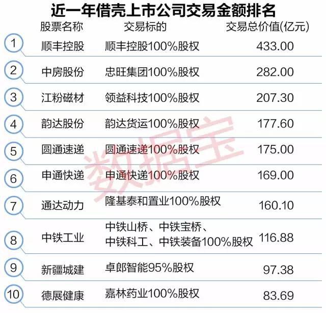 正在进行和已完成借壳上市的公司中,8宗交易超过100亿元。顺丰控股、中房股份、江粉磁材涉及的交易金额居前三,分别为433亿元、282亿元、207亿元。值得注意的是,快递物流企业顺丰控股、韵达股份、圆通速递、申通快递的交易金额均超100亿元。