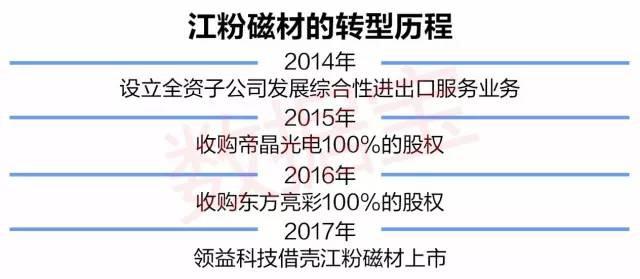 实际上,原本主要生产永磁和软磁铁氧体元件的江粉磁材近年来频繁收购,逐渐进入触控显示器件、精密结构件等业务。2015年江粉磁材收购帝晶光电100%的股权,进入消费电子触控显示模组业务。2016年江粉磁材收购东方亮彩100%的股权,进入智能手机外观结构件领域。