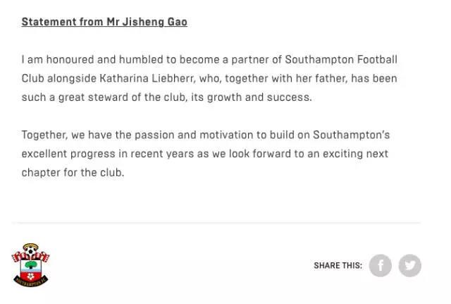 南安普敦俱乐部官方网站登出高继胜声明称,“我非常荣幸成为南安普顿俱乐部的合作伙伴。凯瑟琳娜·利布赫尔(原南安普敦所有人)和她的父亲一直以来管理这家伟大的俱乐部,见证了南安普敦的成长、成功。南安普敦俱乐部近年来取得了长足进步,我们期待着俱乐部的下一个精彩篇章。”