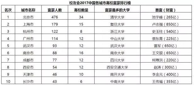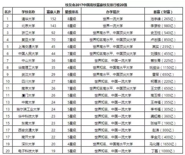 2017年6月22日,艾瑞深中国校友会网《2017中国大学评价研究报告》发布了“2017中国高校富豪校友排行榜”。