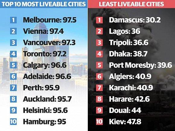 全球宜居城市前10名中,澳大利亚与加拿大各占三席。澳大利亚的墨尔本连续第七年蝉联全球最宜居城市,其次是奥地利的维也纳,加拿大的温哥华、多伦多和卡尔加里分列第3、4、5位。