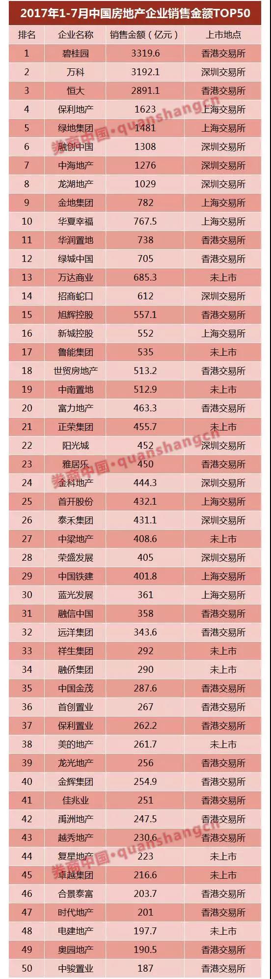 记者统计发现,今年前7个月销售金额前50名的房地产公司中,22家公司选择了在港交所,9家在深交所上市,8家在上交所上市,还有11家公司没有上市。