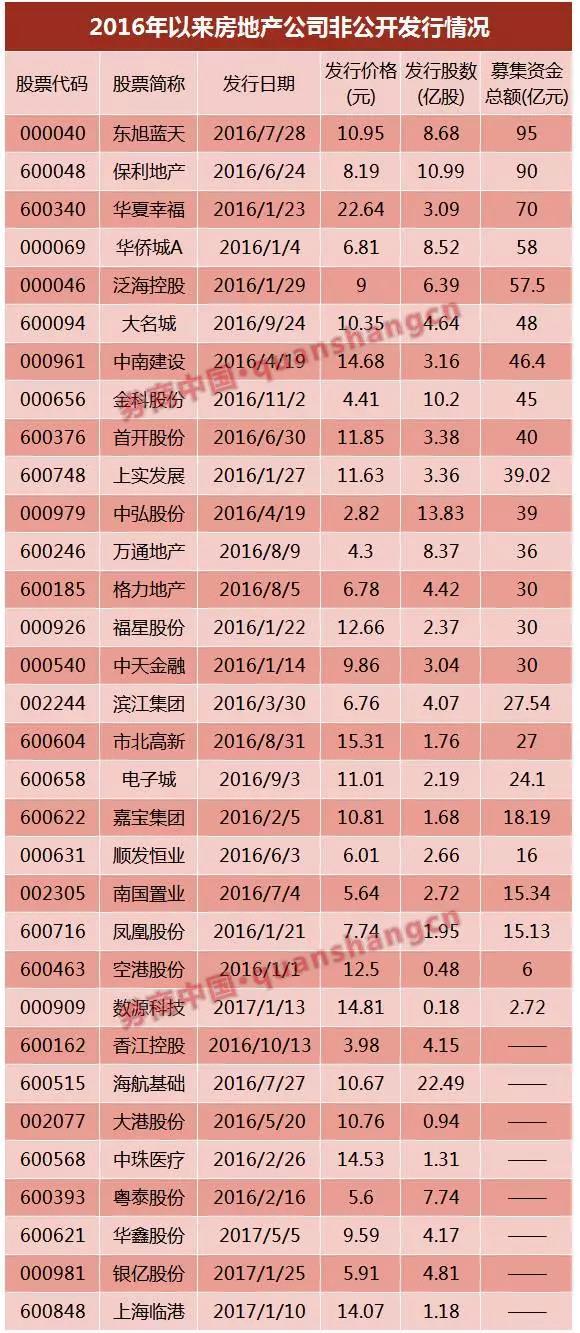 数据显示,2016年以来,在涉及房地产业务的上市公司中,共有包括保利地产、东旭蓝天、华夏幸福等32家上市公司实施了定向增发方案,合计募集资金为905.94亿元。