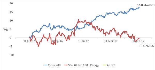在2016年6月至2017年6月30日之前的一整年里,这200家绿色企业平均创造了16.9%的回报率,而标普1200全球能源指数中,石化企业股票平均下跌1.2%。