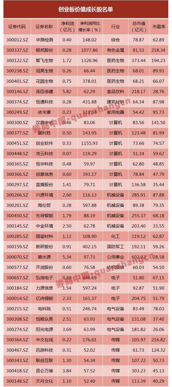 那么创业板中有哪些价值成长股值得我们关注呢?下表是创业板已披露半年报的价值成长股名单。虽然没有明确的定义什么样的股票是价值成长股,但我们先用下面这两个指标作为入选标准: