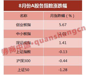 1、创业板8月份涨幅秒杀全市场。以8月份涨幅来看,创业板指大涨5.67%,是几大行情指数中表现最好的,上证50指数及沪深300指数在8月份竟是下跌的。