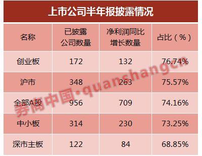 截止8月17日,A股共有956家上市公司披露半年报,其中709家公司净利润实现同比增长,占比为74%;沪市348家上市公司披露263家实现同比增长,占比为75.5%;中小板上市公司283家上市公司披露半年报,其中203家公司净利润实现同比增长,占比为73.8%。