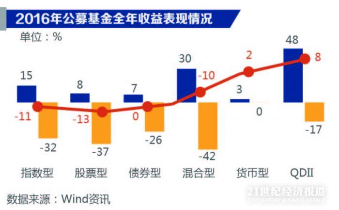 在2016 年股票市场大幅震荡、债券市场信用事件频发的市场环境下,公募基金整体收益表现欠佳。指数型、股票型、混合型的平均收益均为负值,货币型平均收益约2%。QDII 类基金表现亮眼,最高收益达48%,平均收益约8%。