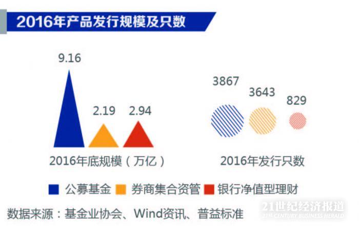 截至2016 年底,券商集合资产管理业务2,规模2.19 万亿元,较2015 年的规模增幅达到40.86%;公募基金业务规模9.16 万亿元3,较2015 年增长9.2%;银行净值型理财产品起步较晚,从发行只数和发行规模上均与券商集合资管和公募基金有较大差距。