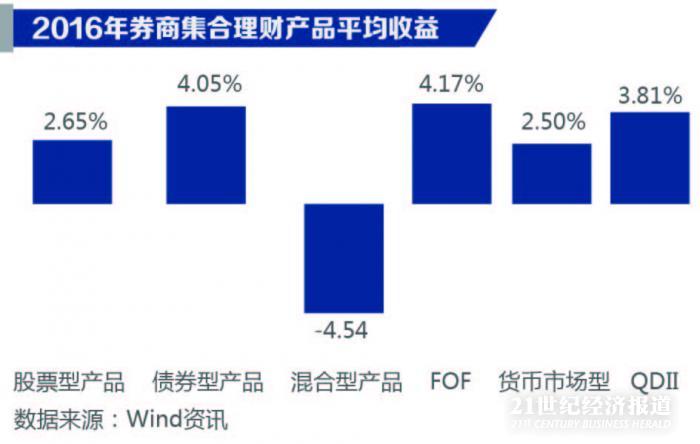 券商集合理财产品在2016 年的整体平均收益表现略好于公募基金。根据Wind 资讯数据的统计,所有成立满一年的集合理财计划中,仅混合型产品的平均收益为负,其余产品平均收益位于0%-4% 左右。整体来看,公募基金及券商集合资管产品的收益表现波动幅度较大,与二级市场情况紧密相连,在2016 年“股债双杀”的市场环境下,平均收益表现并不亮眼。