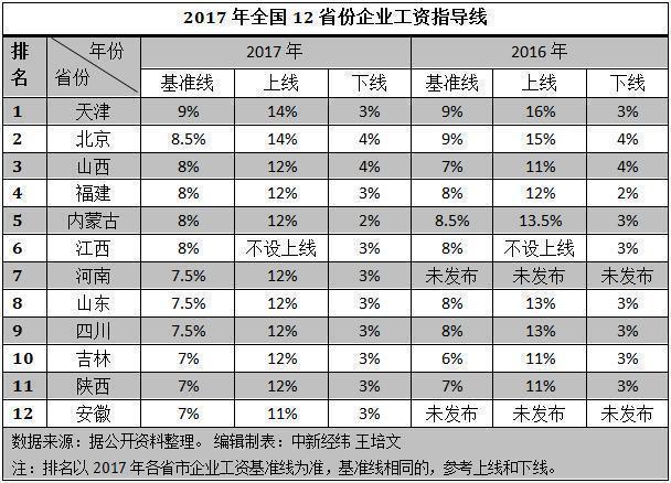 在已公布企业工资指导线的12个省份当中,天津的基准线最高,为9%;北京省紧随其后,基准线为8.5%;基准线最低的为吉林、陕西、安徽,均为7%。