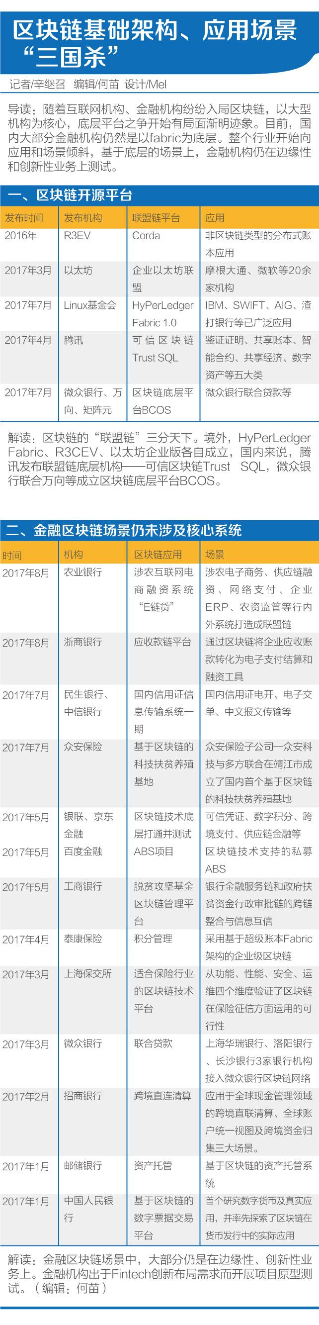 目前,就银行等金融机构而言,国内已开发出基于区块链的跨境清算、信用证、应收账款融资、资产托管、供应链金融等业务场景。场景之下的底层技术平台,也处于激烈竞争之中。
