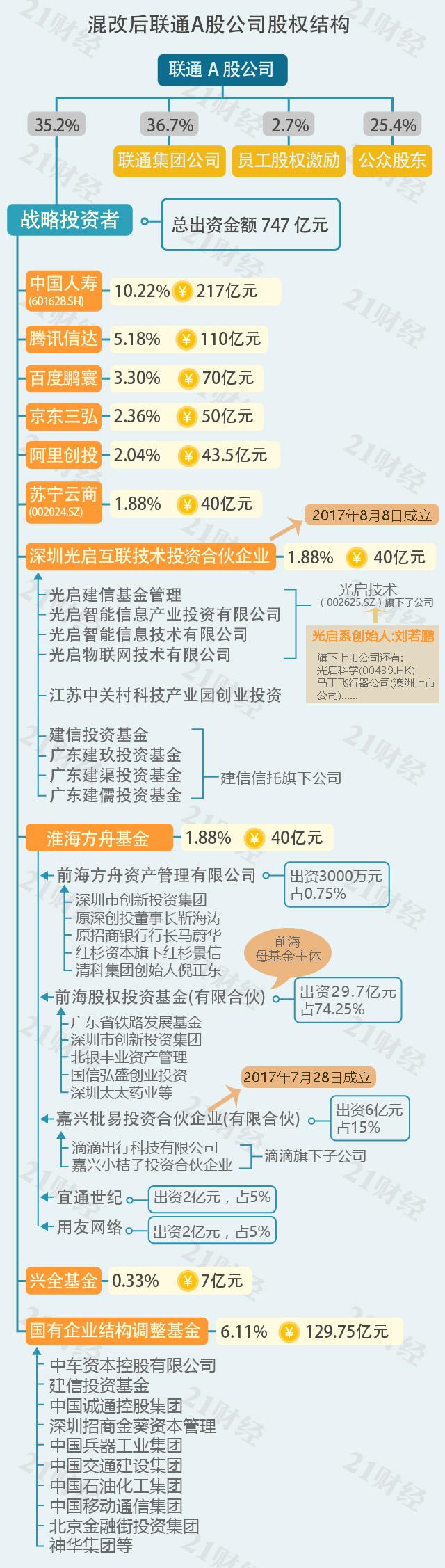 港交所公告显示,联通新引入的战略投资者包括中国人寿、腾讯信达、百度鹏寰、京东三弘、阿里创投、苏宁云商、光启互联、淮海方舟、兴全基金和结构调整基金,合计持有联通A股公司35.19%股份。