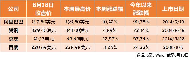 本周,腾讯、阿里在公布业绩后,股价纷纷创下历史新高,其中腾讯最高341港元,阿里最高达169.50美元。有意思的是,在腾讯、阿里股价闻“绩”起舞的同时,百度、京东股价却出现下跌。