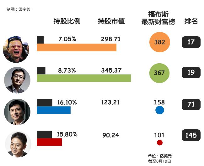 得益于股价、市值的不断飙升,马云、马化腾、李彦宏、刘强东的身价也水涨船高。马云、马化腾最近更是你来我往地问鼎“中国首富”称号。