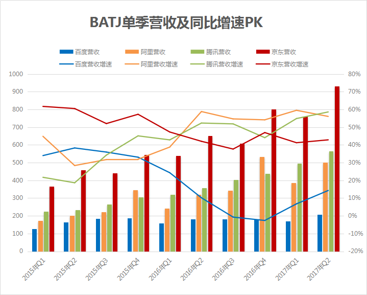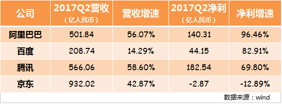本周,腾讯、阿里巴巴相继公布拉仇恨的业绩,至此BATJ(百度、阿里、腾讯、京东)四大互联网巨头的2017年中报全部出齐,业绩一致超出市场预期。