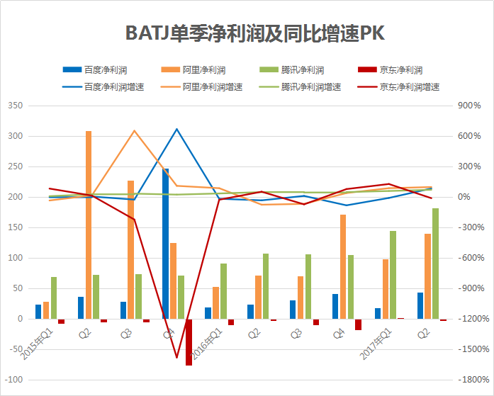 回看过去10个季度的数据,除了腾讯保持20%以上的净利增长外,百度、阿里、京东的净利增速都曾在2015年下半年经历过大幅波动的情形。