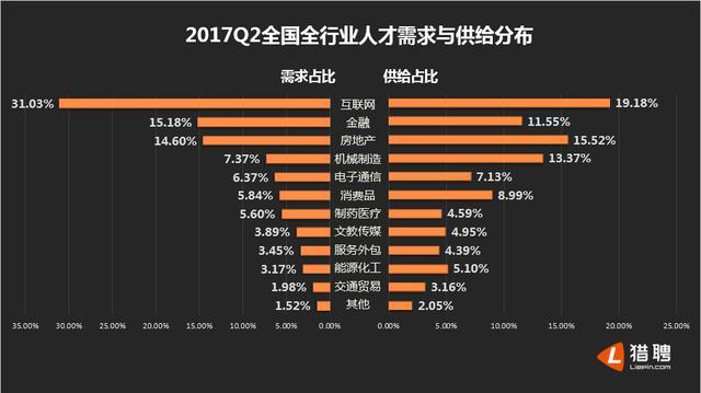 在2017年二季度,全行业人才需求和人才供给占比排名中,位居前六的行业均为互联网、金融、房地产、机械制造、电子通信和消费品。
