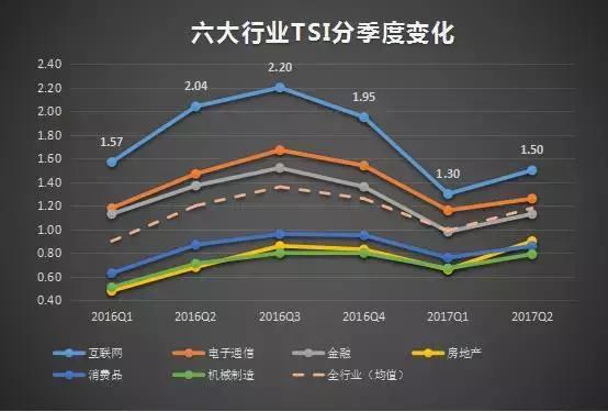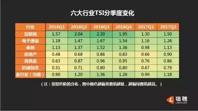 从2016年一季度到2017年二季度期间,全行业TSI(注:Talent Shortage Index,即人才紧缺指数,缩写为TSI=有效需求岗位数/求职人数。TSI>1,表示人才供不应求;TSI<1,表示人才供大于求。如果TSI上升,表示人才紧缺程度加剧)在2016年三季度达到峰值1.36。