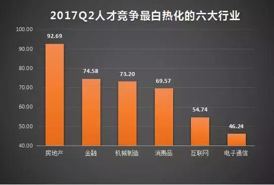 在2017年二季度人才竞争较为白热化的六大行业中,房地产名列第一,平均每个职位有92.69人投递简历;互联网排名倒数第二,平均每个职位有54.74人投递简历;倒数第一的是电子通信行业,平均每个职位有46.24人投递简历。
