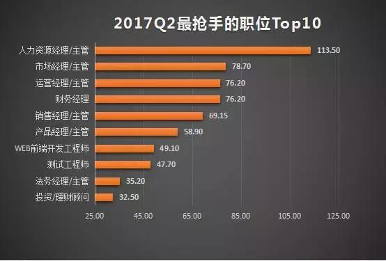 在2017年二季度最抢手的职位中,人力资源经理/主管排名第一,平均每个职位有113.50人竞争。这跟人力资源岗位不分行业、极易跨界的优势密不可分。