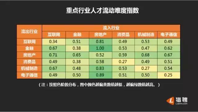 本报告数据显示,在六大行业的跨行业人才流动中,从金融进入房地产行业流动难度指数最高,为1.00;从消费品进入金融行业难度指数最低,为0.38。