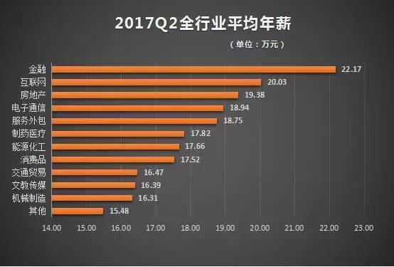 薪资是吸引人才和跨行业流动的一个重要因素。在2017年二季度的全行业平均年薪排名中,金融行业最高,为22.17万元,比名列第二、第三的互联网、房地产分别高出2.14万元、2.79万元。
