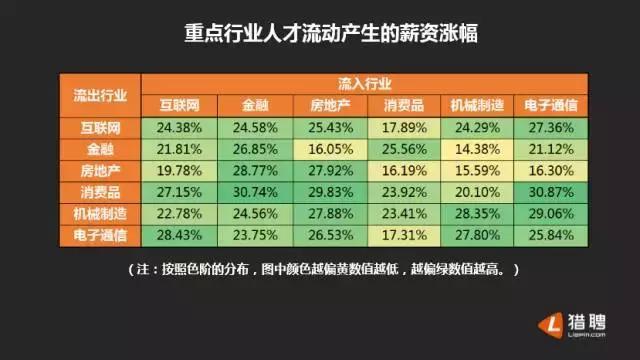 从互联网流入其它各行业的情况来看,流入电子通信薪资涨幅最高,为27.36%;流入消费品涨幅最低,为17.89%。