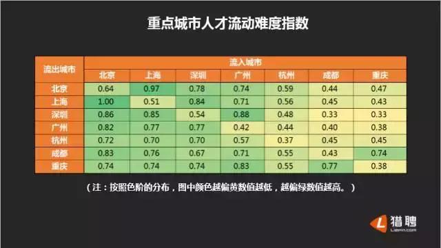 在全国七大主要城市北京、上海、深圳、广州、杭州、成都、重庆的人才流动中,整体而言,人才流入前四个城市难度较大,流入后三个城市难度较小。